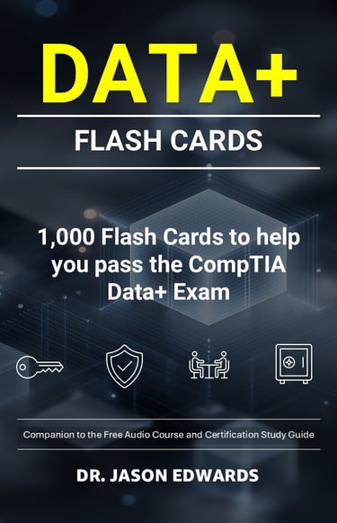 This CompTIA Data+ study system is built as a complete three-part set for busy professionals who need flexibility without sacrificing practical depth. It starts with a free, audio-first course that walks you through the core Data+ concepts in clear, structured episodes you can follow anywhere, then reinforces that learning with a companion guide book that tightens definitions, connects the data lifecycle from intake to insight, and builds the exam-focused judgment Data+ questions demand. Finally, the Kindle flashcards eBook drives high-volume practice with 1,000 question-and-answer prompts that span the full scope of the exam, helping you sharpen recall, recognize what each question is truly testing, and choose the best answer consistently under time pressure.