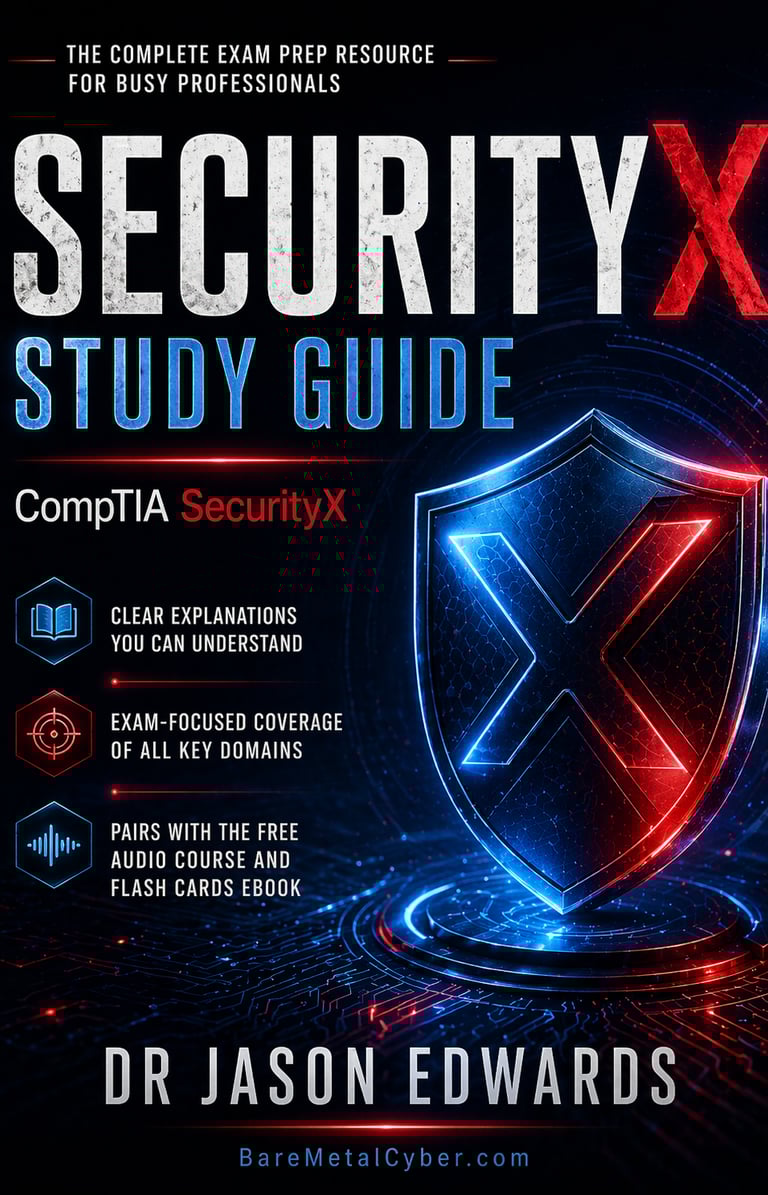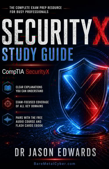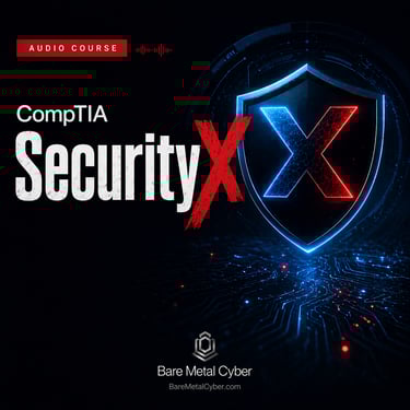 Welcome to The Bare Metal Cyber CompTIA SecurityX Audio Course—your practical companion for preparing for the SecurityX certification. Built for busy professionals who need a strong, usable foundation in advanced security engineering expertise, enterprise-wide risk management knowledge, and strategic security architecture fundamentals, this audio course turns the major SecurityX topics into clear, structured lessons you can follow anytime, anywhere. Each episode stays grounded in real-world technical decisions and exam-aligned thinking, helping you understand not just what to study, but how to reason through complex infrastructure protection, research-driven security principles, and high-stakes global enterprise risks with confidence. Whether you’re commuting, exercising, or fitting in study time after work, this series is designed to keep you consistent, focused, and moving forward.