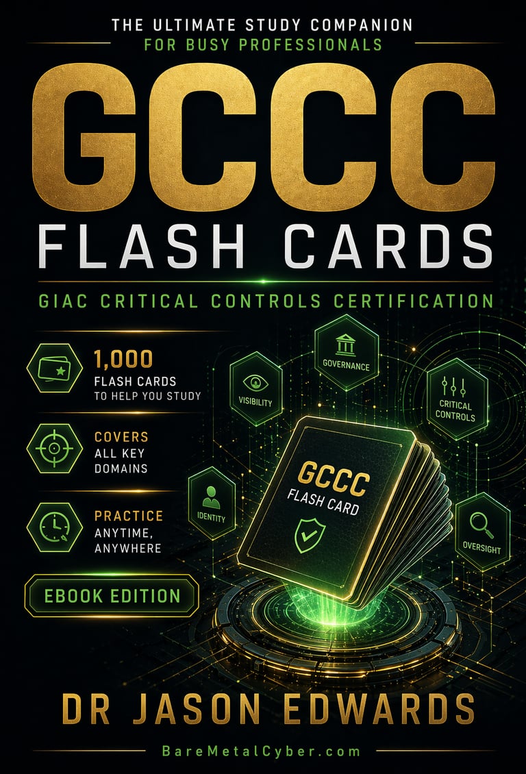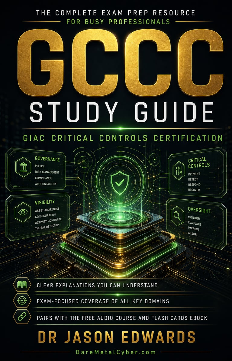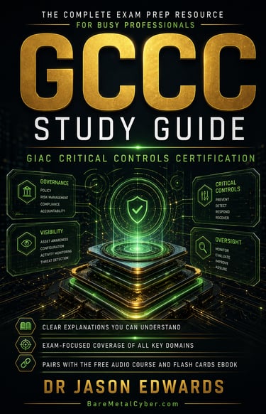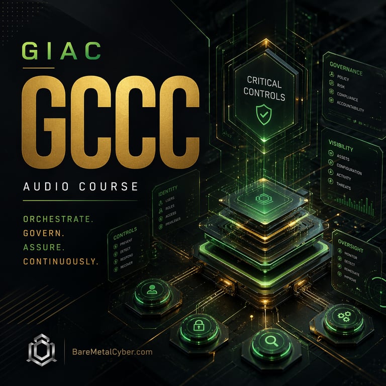 Welcome to The Bare Metal Cyber GIAC Critical Controls Certification (GCCC) Audio Course—your practical companion for preparing for the GCCC certification. Built for busy professionals who need a strong, usable foundation in technical security control implementation and auditing fundamentals, this audio course turns the major GCCC topics into clear, structured lessons you can follow anytime, anywhere. Each episode stays grounded in real-world defensive security decisions and exam-aligned thinking, helping you understand not just what to study, but how to reason through the CIS Critical Security Controls, automation of defenses, and continuous monitoring with confidence. Whether you’re commuting, exercising, or fitting in study time after work, this series is designed to keep you consistent, focused, and moving forward.