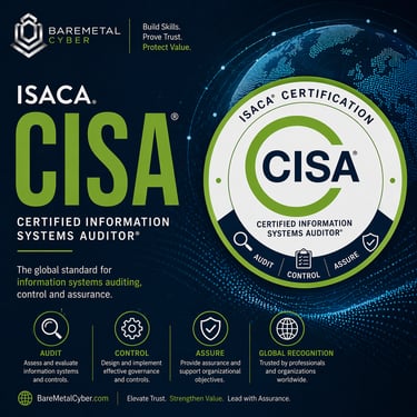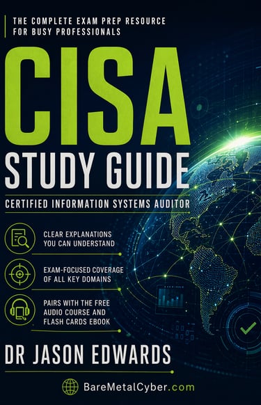 The Bare Metal Cyber CISA Audio Course is your complete, exam-focused companion for mastering the Certified Information Systems Auditor (CISA) certification. Designed for IT auditors, security professionals, and governance specialists, this comprehensive Audio Course transforms the ISACA exam blueprint into over one hundred clear, structured, and engaging episodes. Each lesson delivers practical explanations and real-world context across all five CISA domains—ranging from audit processes and IT governance to systems acquisition, operations, resilience, and information asset protection. Whether you’re driving, exercising, or studying between work sessions, every episode helps you understand key audit principles, retain critical terminology, and apply your knowledge with confidence.