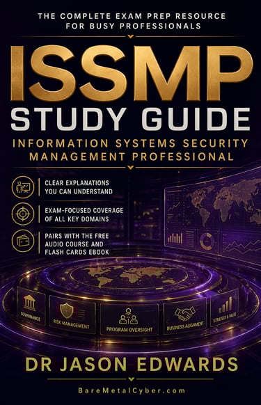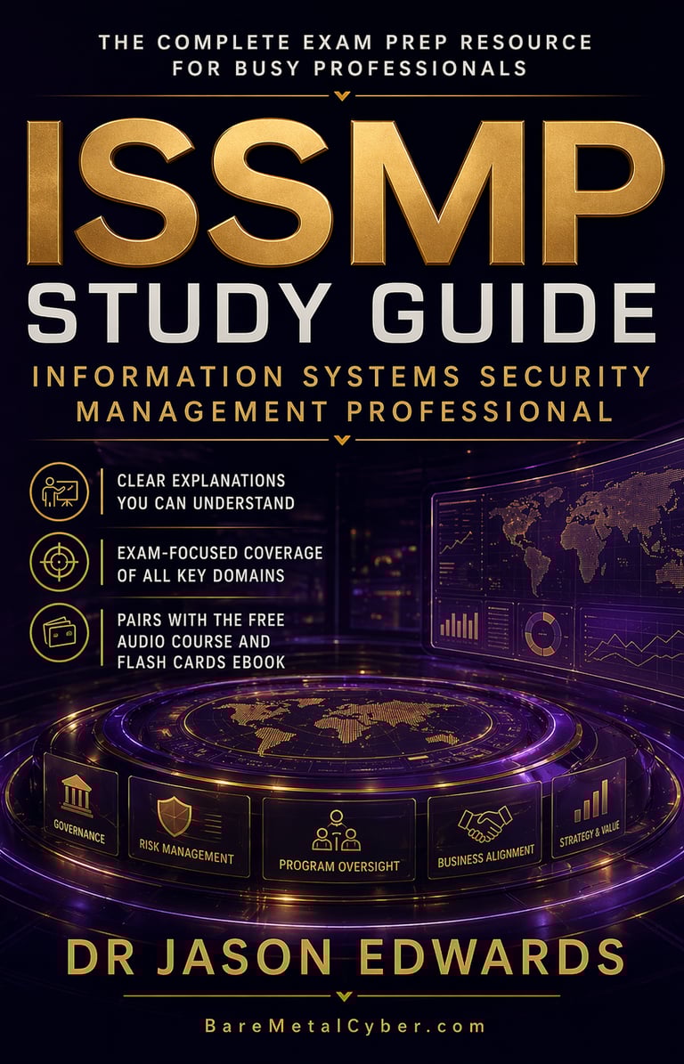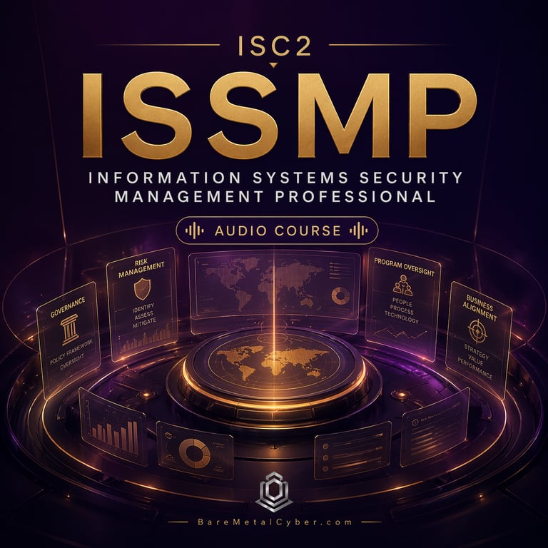 Welcome to The Bare Metal Cyber Information Systems Security Management Professional (ISSMP) Audio Course—your practical companion for preparing for the ISSMP certification. Built for busy professionals who need a strong, usable foundation in strategic security leadership, enterprise-wide program management, and high-level governance fundamentals, this audio course turns the major ISSMP topics into clear, structured lessons you can follow anytime, anywhere. Each episode stays grounded in real-world executive decisions and exam-aligned thinking, helping you understand not just what to study, but how to reason through security management principles, business continuity planning, and complex organizational risk oversight with confidence. Whether you’re commuting, exercising, or fitting in study time after work, this series is designed to keep you consistent, focused, and moving forward.
