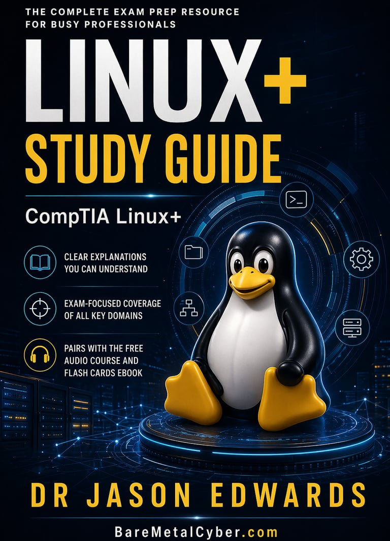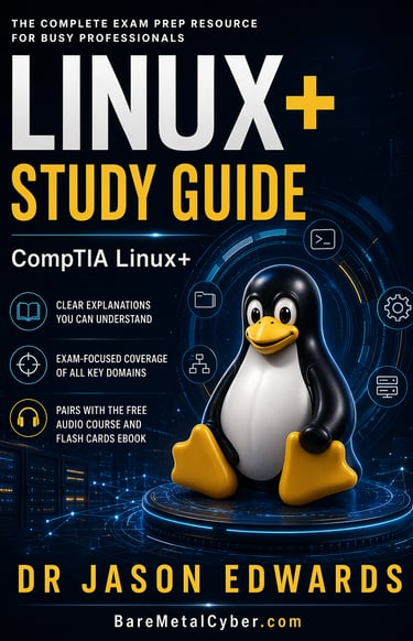 Welcome to The Bare Metal Cyber linux+ Audio Course—your practical companion for preparing for the CompTIA linux+ certification. Built for busy professionals who need a strong, usable foundation in Linux administration, this audio course turns the major linux+ topics into clear, structured lessons you can follow anytime, anywhere. Each episode stays grounded in real-world admin work and exam-aligned thinking, helping you understand not just what to study, but how to reason through command-line fundamentals, filesystems and storage basics, permissions and ownership, users and groups, process and service management, package management, networking fundamentals, security practices, and troubleshooting with confidence. Whether you’re commuting, exercising, or fitting in study time after work, this series is designed to keep you consistent, focused, and moving forward.